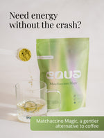 Drink contains naturally occurring caffeine from matcha, in a lower amount than coffee, alongside L-theanine and adaptogens for a more balanced and steady energy release.