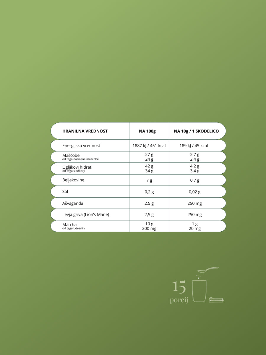 Coconut milk powder (55,4%), coconut sugar, matcha powder (10%), lion’s mane extract (2,5%), cinnamon powder (1%), ashwagandha (0,8%), flavouring.